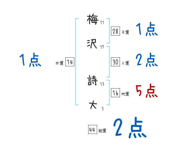 外運![]() | 梅沢詩大さんの外運は14画の1つ星!人に対して優しいがストレスを溜め込みがち。人間関係のトラブルを避けるよう気をつけましょう。 生活面を象徴する運勢です。外部から受ける影響力を表し、結婚運、家庭運や職場、環境への順応性を表します。 |