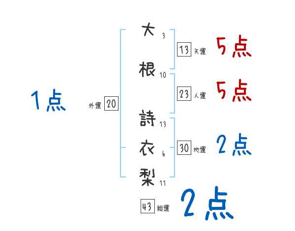 天運![]() | 大根詩衣梨さんの天運は13画の5つ星!才能に恵まれ人気がある。名声を手に入れる。円満な人生。 家系が持つ宿命的な運勢を表します。祖先から受け継いだ苗字ですので自分の力が及びません。家柄を象徴します。 |