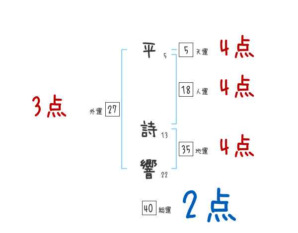 外運![]() | 平詩響さんの外運は27画の3つ星!頭脳明晰だが強情で摩擦が多い傾向。孤立に注意。 生活面を象徴する運勢です。外部から受ける影響力を表し、結婚運、家庭運や職場、環境への順応性を表します。 |
