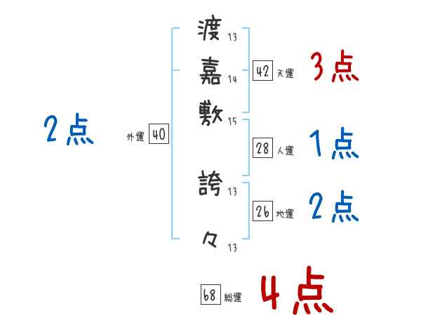 地運![]() | 渡嘉敷誇々さんの地運は26画の2つ星!波瀾万丈かも。信頼できる人を大事にしましょう。 個性を表す基礎的な運勢です。性格形成や対人関係、行動力など家庭環境に影響されます。主に誕生してから20歳くらいまでの若年期の運勢を表します。 |