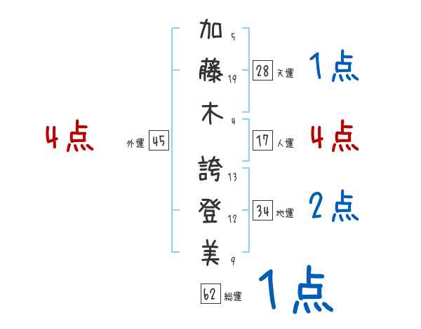 天運![]() | 加藤木誇登美さんの天運は28画の1つ星!家庭環境に注意。スポーツで活躍できる能力があるかも。 家系が持つ宿命的な運勢を表します。祖先から受け継いだ苗字ですので自分の力が及びません。家柄を象徴します。 |