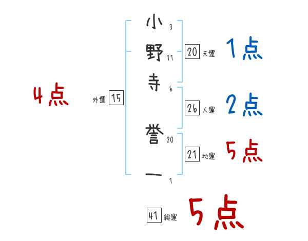 地運![]() | 小野寺誉一さんの地運は21画の5つ星!統率力がある。独立し成功する。名誉を手に入れる。 個性を表す基礎的な運勢です。性格形成や対人関係、行動力など家庭環境に影響されます。主に誕生してから20歳くらいまでの若年期の運勢を表します。 |