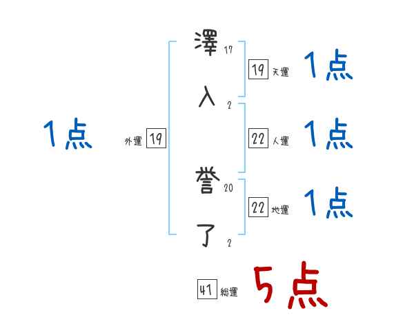天運![]() | 澤入誉了さんの天運は19画の1つ星!優れた才能を持ちますが、協調性が足りないことも。周りの人と協力する事を意識しましょう。 家系が持つ宿命的な運勢を表します。祖先から受け継いだ苗字ですので自分の力が及びません。家柄を象徴します。 |