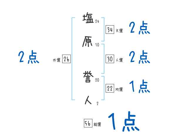 外運![]() | 塩原誉人さんの外運は26画の2つ星!波瀾万丈かも。信頼できる人を大事にしましょう。 生活面を象徴する運勢です。外部から受ける影響力を表し、結婚運、家庭運や職場、環境への順応性を表します。 |