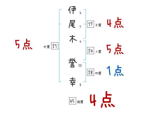 外運![]() | 伊尾木誉幸さんの外運は21画の5つ星!統率力がある。独立し成功する。名誉を手に入れる。 生活面を象徴する運勢です。外部から受ける影響力を表し、結婚運、家庭運や職場、環境への順応性を表します。 |