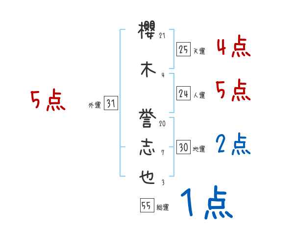総運![]() | 櫻木誉志也さんの総運は55画の1つ星!欲張りな性格で軽率な行動に注意しましょう。病気に気をつけて。 あなたの人生を表す1番重要な運勢です。生涯を通じて影響する総合運となり、主に50歳以降の晩年期に影響を及ぼします。 |