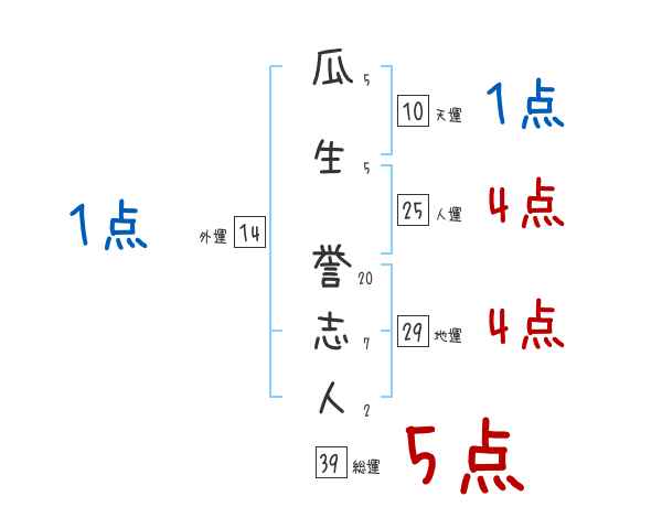 天運![]() | 瓜生誉志人さんの天運は10画の1つ星!不安を感じやすい傾向。ストレスを抱えないように注意しましょう。 家系が持つ宿命的な運勢を表します。祖先から受け継いだ苗字ですので自分の力が及びません。家柄を象徴します。 |