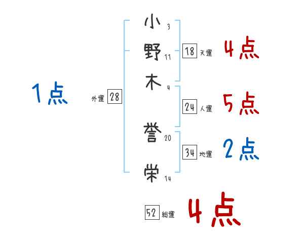 天運![]() | 小野木誉栄さんの天運は18画の4つ星!情熱的で剛気。忍耐力があり信頼される。 家系が持つ宿命的な運勢を表します。祖先から受け継いだ苗字ですので自分の力が及びません。家柄を象徴します。 |