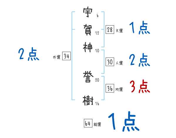 地運![]() | 宇賀神誉樹さんの地運は36画の3つ星!先見性が豊かです。多少神経質で苦労することも。 個性を表す基礎的な運勢です。性格形成や対人関係、行動力など家庭環境に影響されます。主に誕生してから20歳くらいまでの若年期の運勢を表します。 |