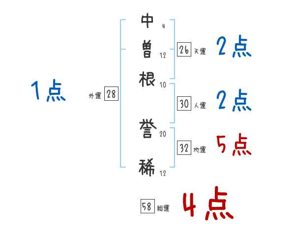 外運![]() | 中曽根誉稀さんの外運は28画の1つ星!家庭環境に注意。スポーツで活躍できる能力があるかも。 生活面を象徴する運勢です。外部から受ける影響力を表し、結婚運、家庭運や職場、環境への順応性を表します。 |