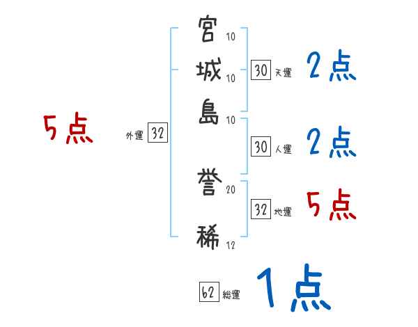 外運![]() | 宮城島誉稀さんの外運は32画の5つ星!柔軟性があり成功する。チャンスが多く金運が良い。 生活面を象徴する運勢です。外部から受ける影響力を表し、結婚運、家庭運や職場、環境への順応性を表します。 |
