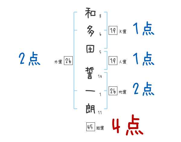 外運![]() | 和多田誓一朗さんの外運は26画の2つ星!波瀾万丈かも。信頼できる人を大事にしましょう。 生活面を象徴する運勢です。外部から受ける影響力を表し、結婚運、家庭運や職場、環境への順応性を表します。 |