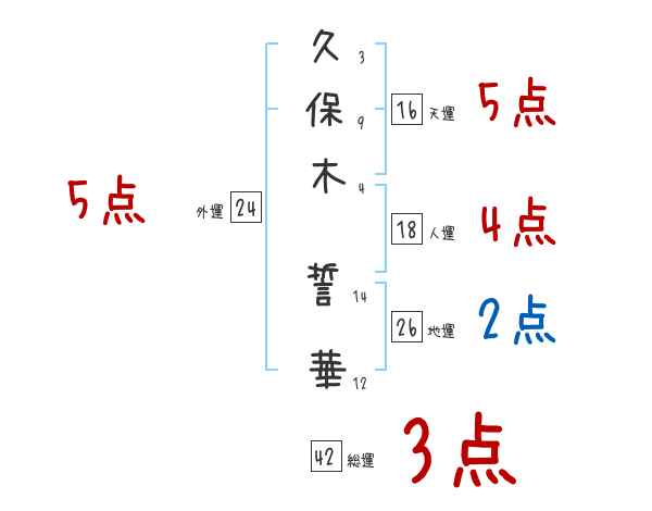 天運![]() | 久保木誓華さんの天運は16画の5つ星!人望が厚く大きく発展する。逆転成功が見える。 家系が持つ宿命的な運勢を表します。祖先から受け継いだ苗字ですので自分の力が及びません。家柄を象徴します。 |
