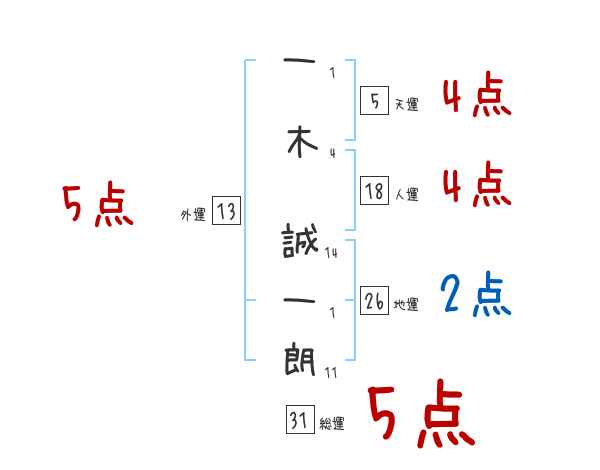 天運![]() | 一木誠一朗さんの天運は5画の4つ星!健康で安泰。協調性に優れ、財産に恵まれる。 家系が持つ宿命的な運勢を表します。祖先から受け継いだ苗字ですので自分の力が及びません。家柄を象徴します。 |