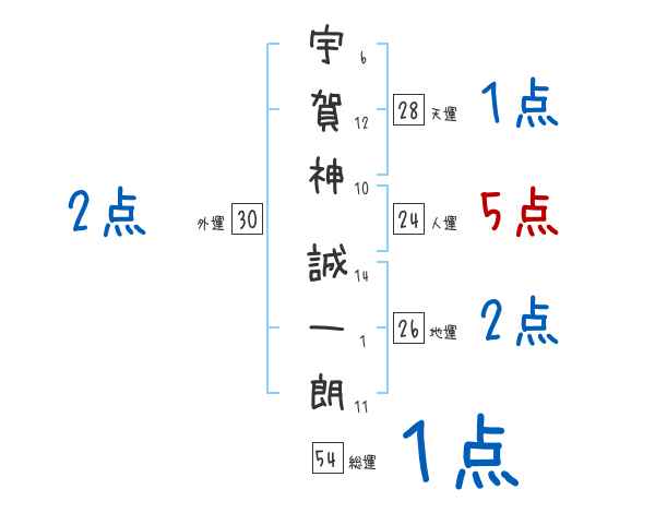 人運![]() | 宇賀神誠一朗さんの人運は24画の5つ星!家庭運が良く順調な人生。金運にも恵まれる。 性格や才能などを表す2番目に重要な運勢です。人間関係や協調性、社会的な成功に影響します。主に20歳から50歳ぐらいまでの中年期の運勢を表します。 |