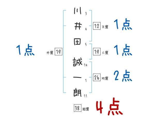 天運![]() | 川井田誠一朗さんの天運は12画の1つ星!簡単な失敗で諦めてしまいやすいかも。着実に行動すると良いでしょう。 家系が持つ宿命的な運勢を表します。祖先から受け継いだ苗字ですので自分の力が及びません。家柄を象徴します。 |