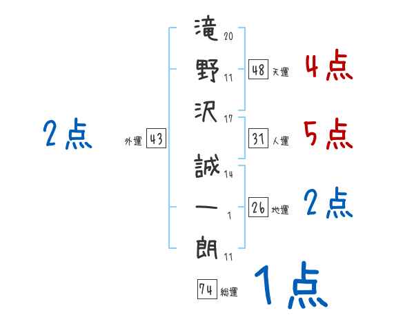 天運![]() | 滝野沢誠一朗さんの天運は48画の4つ星!賢明な性格で人望が厚い。指導力があり多くの人に尊敬される。 家系が持つ宿命的な運勢を表します。祖先から受け継いだ苗字ですので自分の力が及びません。家柄を象徴します。 |