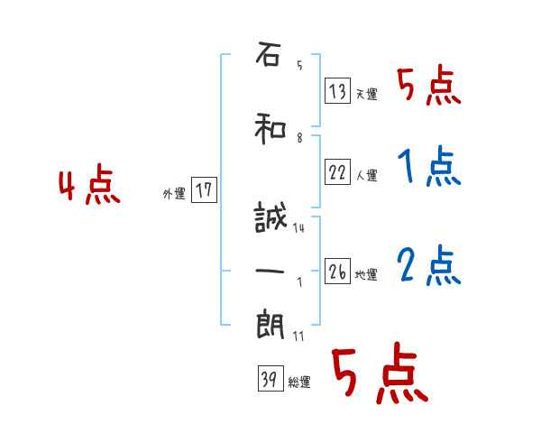 総運![]() | 石和誠一朗さんの総運は39画の5つ星!社交性に優れ人望が厚い。人の上に立ち成功する。 あなたの人生を表す1番重要な運勢です。生涯を通じて影響する総合運となり、主に50歳以降の晩年期に影響を及ぼします。 |