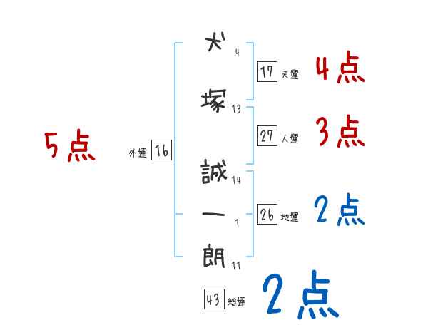 天運![]() | 犬塚誠一朗さんの天運は17画の4つ星!積極的な行動力。地位を気づき財産を手に入れる。純粋な心と直感力。 家系が持つ宿命的な運勢を表します。祖先から受け継いだ苗字ですので自分の力が及びません。家柄を象徴します。 |
