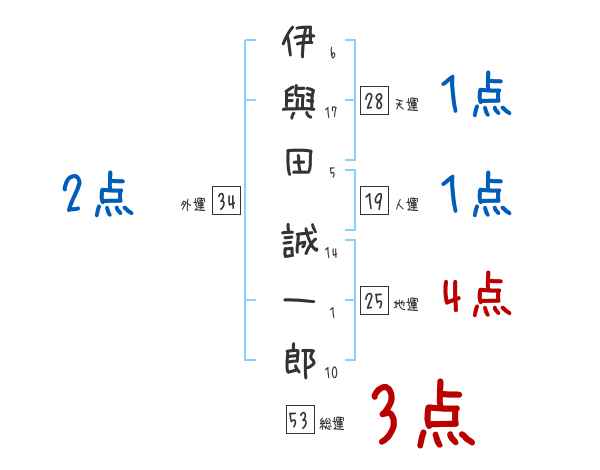 天運![]() | 伊與田誠一郎さんの天運は28画の1つ星!家庭環境に注意。スポーツで活躍できる能力があるかも。 家系が持つ宿命的な運勢を表します。祖先から受け継いだ苗字ですので自分の力が及びません。家柄を象徴します。 |