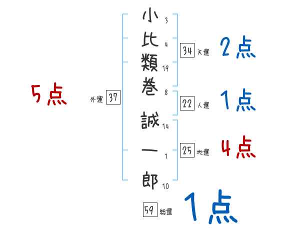 外運![]() | 小比類巻誠一郎さんの外運は37画の5つ星!努力家で順応性に優れる。現実的な考え方ができ忠実に物事をこなす。 生活面を象徴する運勢です。外部から受ける影響力を表し、結婚運、家庭運や職場、環境への順応性を表します。 |