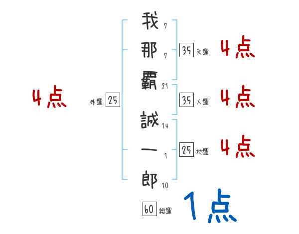 天運![]() | 我那覇誠一郎さんの天運は35画の4つ星!温厚な性格で感受性が高い。穏和な性格で人望が厚い。 家系が持つ宿命的な運勢を表します。祖先から受け継いだ苗字ですので自分の力が及びません。家柄を象徴します。 |