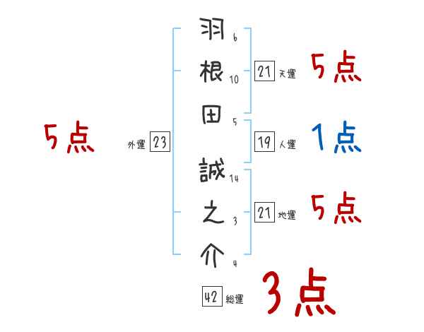 天運![]() | 羽根田誠之介さんの天運は21画の5つ星!統率力がある。独立し成功する。名誉を手に入れる。 家系が持つ宿命的な運勢を表します。祖先から受け継いだ苗字ですので自分の力が及びません。家柄を象徴します。 |