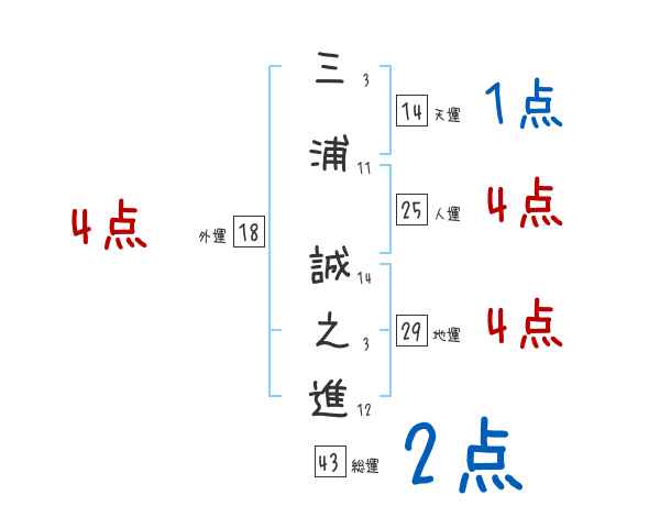 天運![]() | 三浦誠之進さんの天運は14画の1つ星!人に対して優しいがストレスを溜め込みがち。人間関係のトラブルを避けるよう気をつけましょう。 家系が持つ宿命的な運勢を表します。祖先から受け継いだ苗字ですので自分の力が及びません。家柄を象徴します。 |