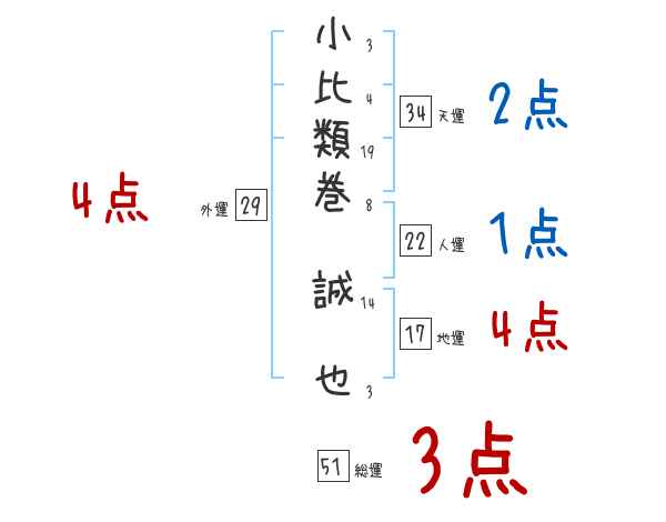 外運![]() | 小比類巻誠也さんの外運は29画の4つ星!完全主義で才能がある。厳格な心の持ち主。 生活面を象徴する運勢です。外部から受ける影響力を表し、結婚運、家庭運や職場、環境への順応性を表します。 |