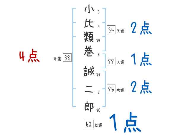 天運![]() | 小比類巻誠二郎さんの天運は34画の2つ星!独創性に優れるが、自尊心が強く災難に注意しましょう。 家系が持つ宿命的な運勢を表します。祖先から受け継いだ苗字ですので自分の力が及びません。家柄を象徴します。 |