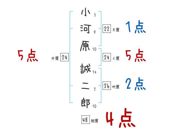外運![]() | 小河原誠二郎さんの外運は24画の5つ星!家庭運が良く順調な人生。金運にも恵まれる。 生活面を象徴する運勢です。外部から受ける影響力を表し、結婚運、家庭運や職場、環境への順応性を表します。 |