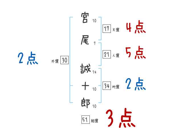 総運![]() | 宮尾誠十郎さんの総運は51画の3つ星!変化が激しく、危険に注意。堅実な性格。 あなたの人生を表す1番重要な運勢です。生涯を通じて影響する総合運となり、主に50歳以降の晩年期に影響を及ぼします。 |