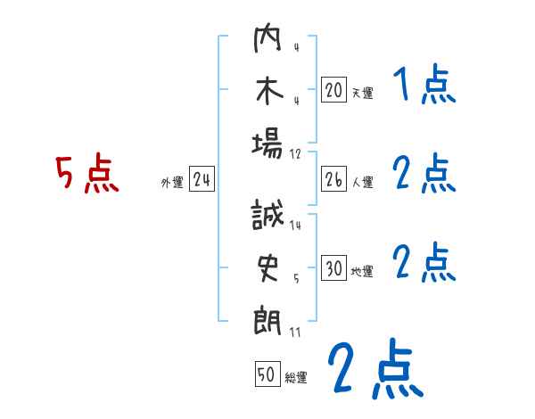外運![]() | 内木場誠史朗さんの外運は24画の5つ星!家庭運が良く順調な人生。金運にも恵まれる。 生活面を象徴する運勢です。外部から受ける影響力を表し、結婚運、家庭運や職場、環境への順応性を表します。 |