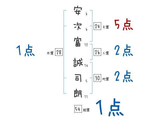 天運![]() | 安次富誠司朗さんの天運は24画の5つ星!家庭運が良く順調な人生。金運にも恵まれる。 家系が持つ宿命的な運勢を表します。祖先から受け継いだ苗字ですので自分の力が及びません。家柄を象徴します。 |