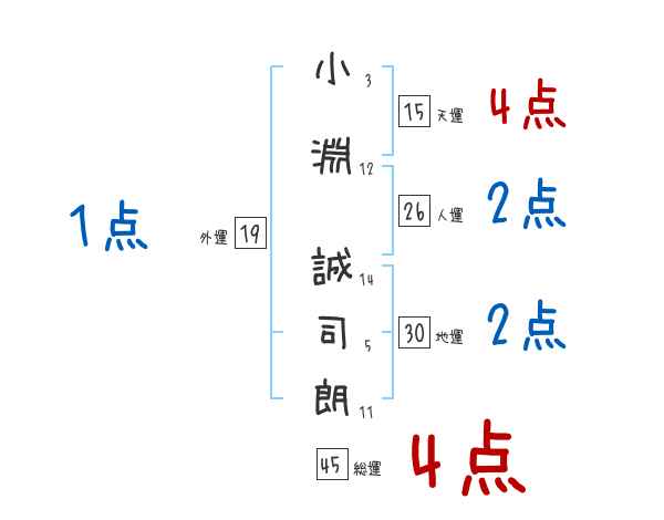 天運![]() | 小淵誠司朗さんの天運は15画の4つ星!人徳があり出世する。順調に物事を進め円満な人生。 家系が持つ宿命的な運勢を表します。祖先から受け継いだ苗字ですので自分の力が及びません。家柄を象徴します。 |