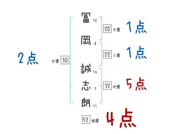 総運![]() | 冨岡誠志朗さんの総運は52画の4つ星!先見性と独創性に優れ考える力がある。強運の持ち主。 あなたの人生を表す1番重要な運勢です。生涯を通じて影響する総合運となり、主に50歳以降の晩年期に影響を及ぼします。 |