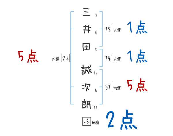 外運![]() | 三井田誠次朗さんの外運は24画の5つ星!家庭運が良く順調な人生。金運にも恵まれる。 生活面を象徴する運勢です。外部から受ける影響力を表し、結婚運、家庭運や職場、環境への順応性を表します。 |