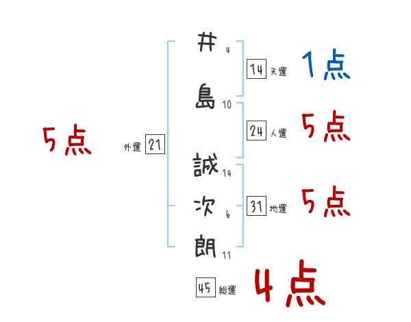 外運![]() | 井島誠次朗さんの外運は21画の5つ星!統率力がある。独立し成功する。名誉を手に入れる。 生活面を象徴する運勢です。外部から受ける影響力を表し、結婚運、家庭運や職場、環境への順応性を表します。 |