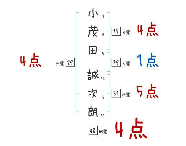 外運![]() | 小茂田誠次朗さんの外運は29画の4つ星!完全主義で才能がある。厳格な心の持ち主。 生活面を象徴する運勢です。外部から受ける影響力を表し、結婚運、家庭運や職場、環境への順応性を表します。 |