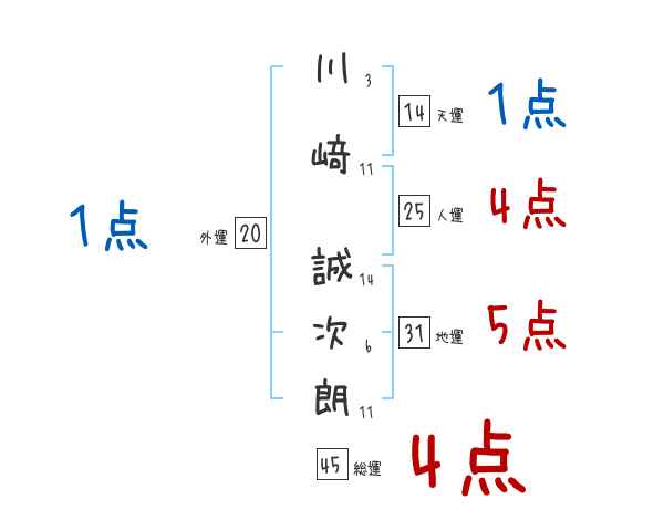 総運![]() | 川﨑誠次朗さんの総運は45画の4つ星!もくもくと物事を進め達成する。地味な努力家。 あなたの人生を表す1番重要な運勢です。生涯を通じて影響する総合運となり、主に50歳以降の晩年期に影響を及ぼします。 |