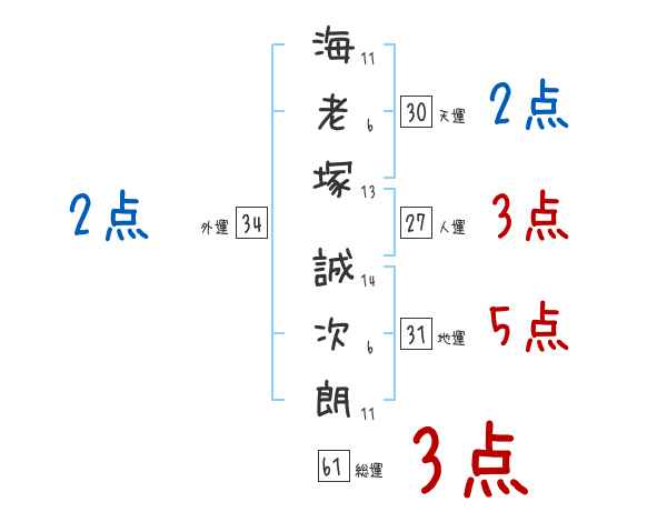 天運![]() | 海老塚誠次朗さんの天運は30画の2つ星!浮き沈みの激しさに注意しましょう。 家系が持つ宿命的な運勢を表します。祖先から受け継いだ苗字ですので自分の力が及びません。家柄を象徴します。 |