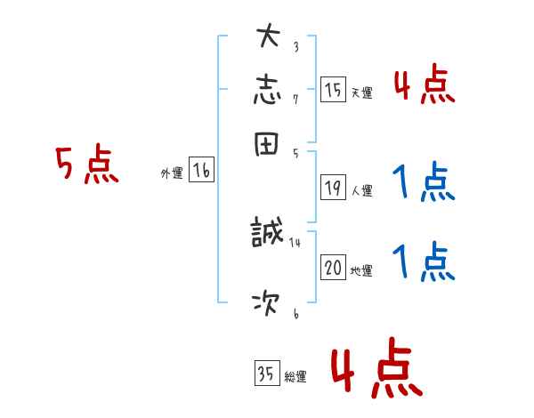 総運![]() | 大志田誠次さんの総運は35画の4つ星!温厚な性格で感受性が高い。穏和な性格で人望が厚い。 あなたの人生を表す1番重要な運勢です。生涯を通じて影響する総合運となり、主に50歳以降の晩年期に影響を及ぼします。 |
