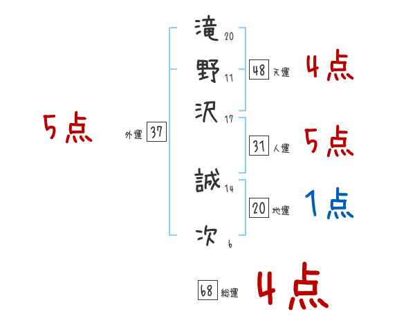 外運![]() | 滝野沢誠次さんの外運は37画の5つ星!努力家で順応性に優れる。現実的な考え方ができ忠実に物事をこなす。 生活面を象徴する運勢です。外部から受ける影響力を表し、結婚運、家庭運や職場、環境への順応性を表します。 |