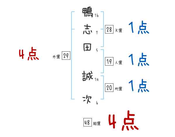 外運![]() | 鴨志田誠次さんの外運は29画の4つ星!完全主義で才能がある。厳格な心の持ち主。 生活面を象徴する運勢です。外部から受ける影響力を表し、結婚運、家庭運や職場、環境への順応性を表します。 |