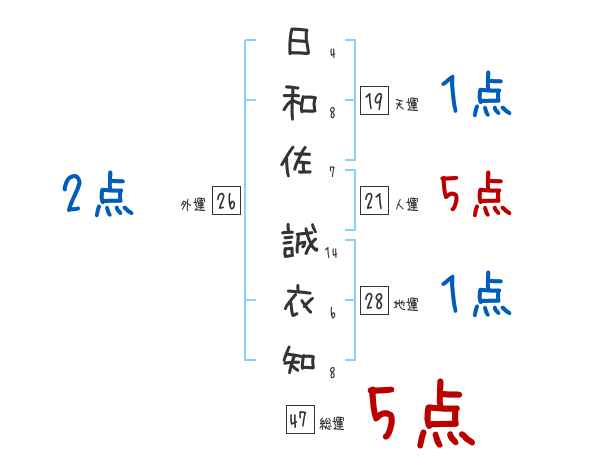 総運![]() | 日和佐誠衣知さんの総運は47画の5つ星!実力が開花し発展する円満な人生。財に恵まれる。 あなたの人生を表す1番重要な運勢です。生涯を通じて影響する総合運となり、主に50歳以降の晩年期に影響を及ぼします。 |