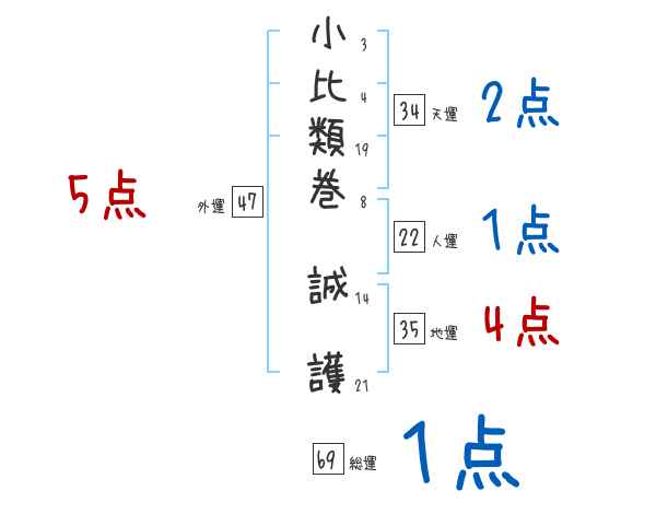 外運![]() | 小比類巻誠護さんの外運は47画の5つ星!実力が開花し発展する円満な人生。財に恵まれる。 生活面を象徴する運勢です。外部から受ける影響力を表し、結婚運、家庭運や職場、環境への順応性を表します。 |
