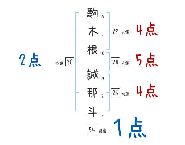 総運![]() | 駒木根誠那斗さんの総運は54画の1つ星!トラブルが多いかも。周りをよく見て協調して過ごしましょう。 あなたの人生を表す1番重要な運勢です。生涯を通じて影響する総合運となり、主に50歳以降の晩年期に影響を及ぼします。 |