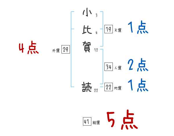 地運![]() | 小比賀読さんの地運は22画の1つ星!努力することが苦手ないっぽう手先が器用。芸術性にも優れる。 個性を表す基礎的な運勢です。性格形成や対人関係、行動力など家庭環境に影響されます。主に誕生してから20歳くらいまでの若年期の運勢を表します。 |