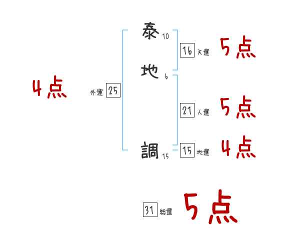 天運![]() | 泰地調さんの天運は16画の5つ星!人望が厚く大きく発展する。逆転成功が見える。 家系が持つ宿命的な運勢を表します。祖先から受け継いだ苗字ですので自分の力が及びません。家柄を象徴します。 |