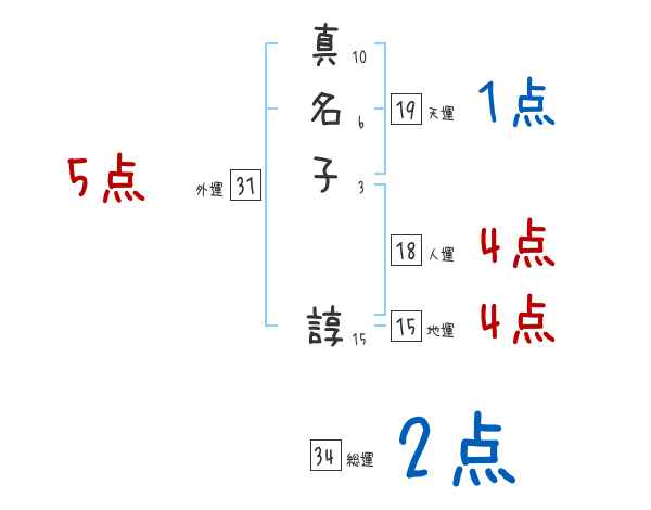 総運![]() | 真名子諄さんの総運は34画の2つ星!独創性に優れるが、自尊心が強く災難に注意しましょう。 あなたの人生を表す1番重要な運勢です。生涯を通じて影響する総合運となり、主に50歳以降の晩年期に影響を及ぼします。 |